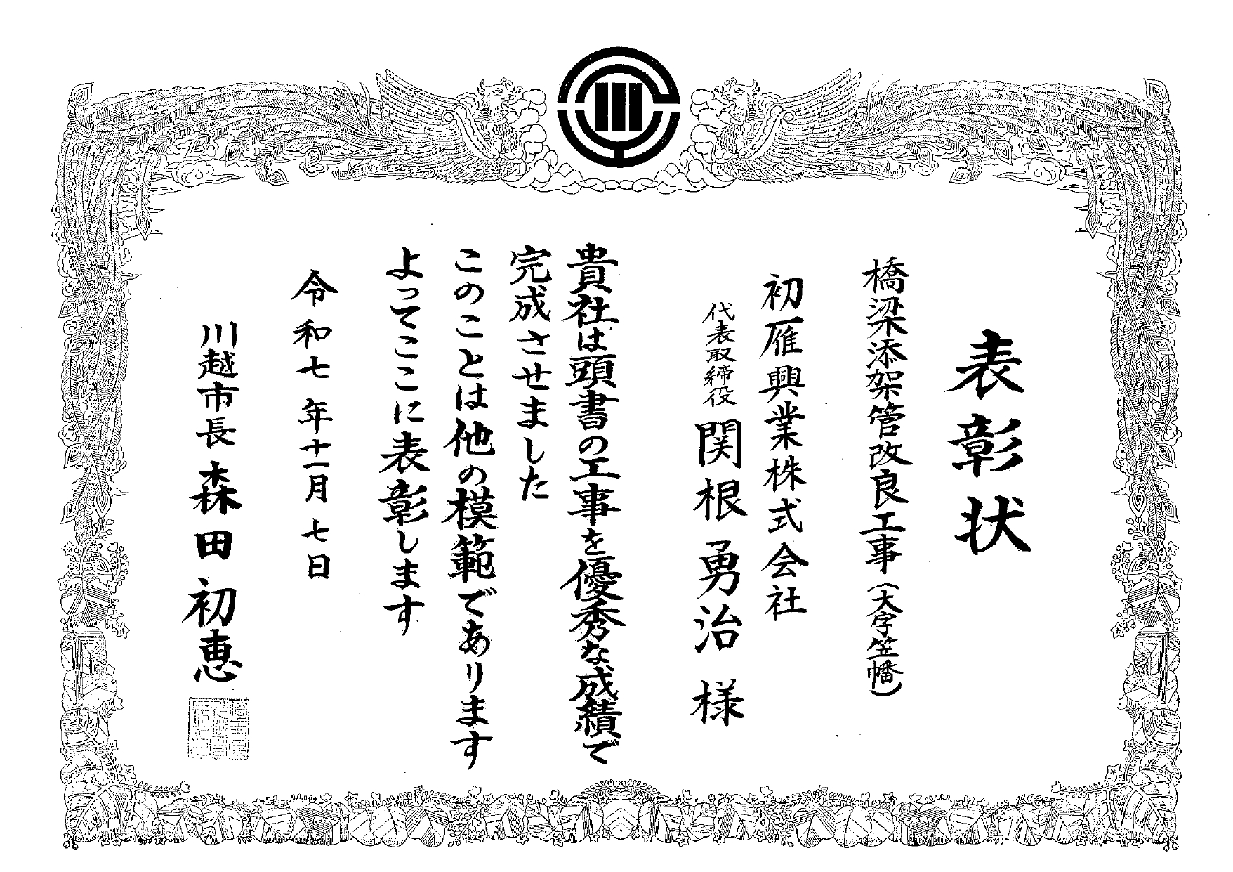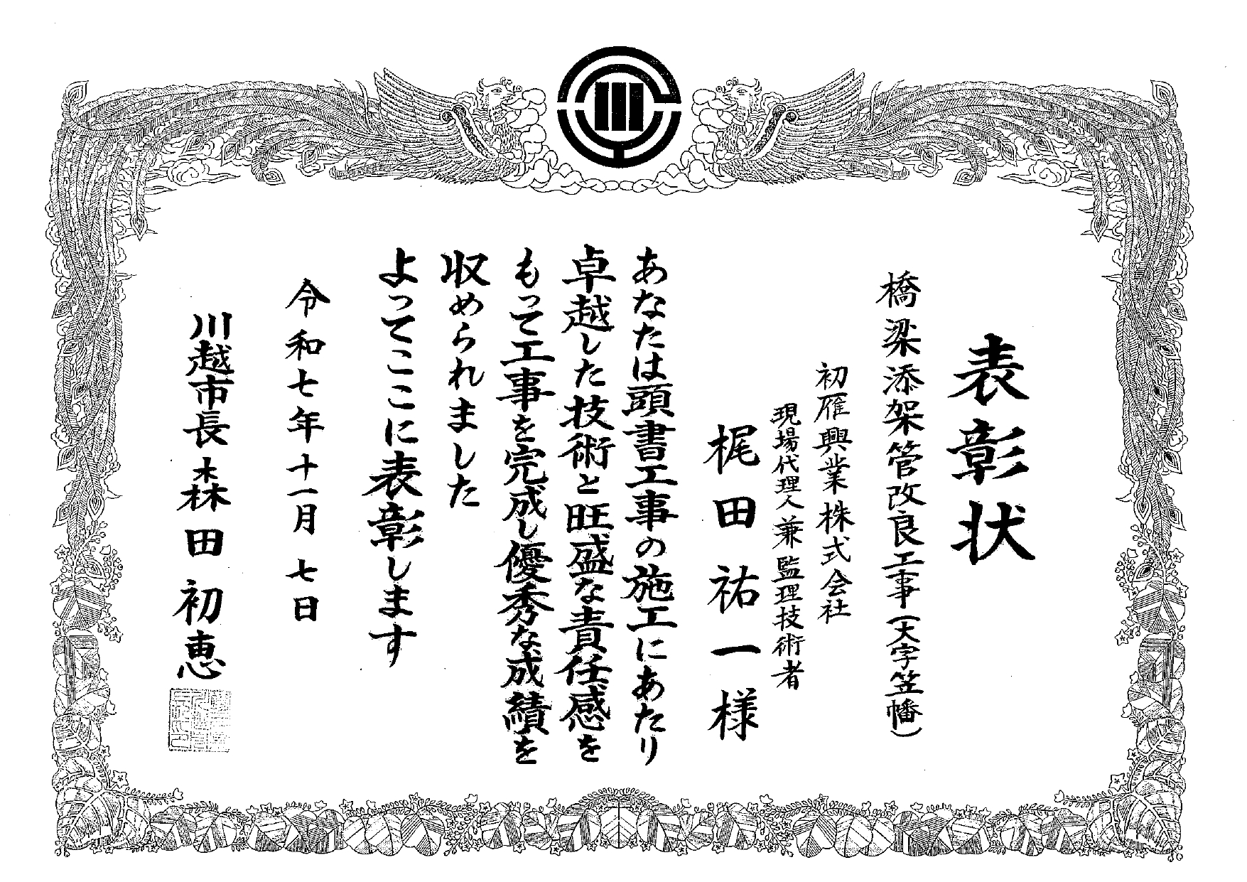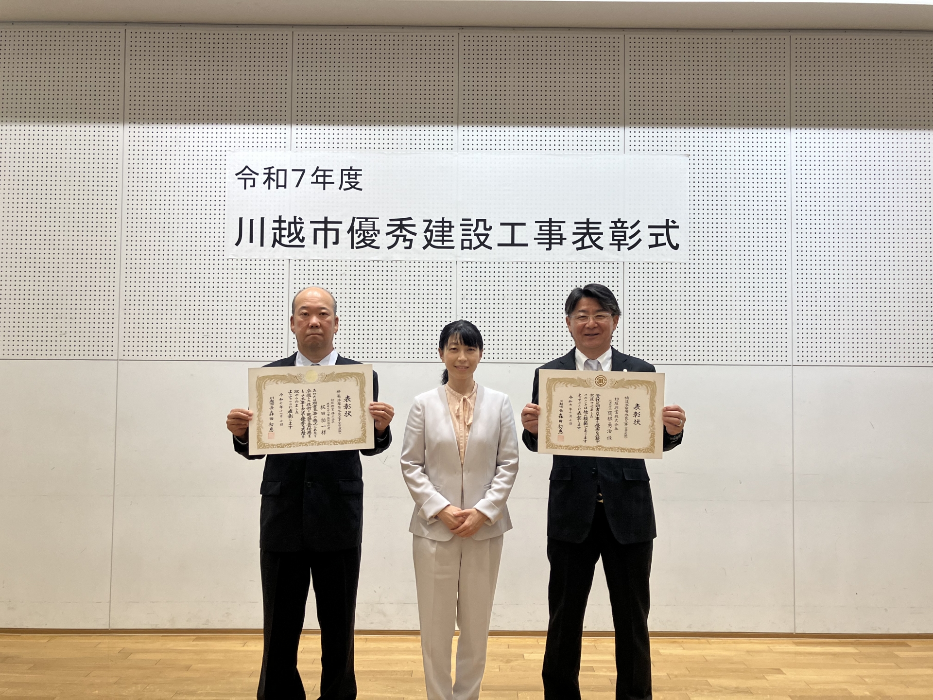 2025年11月7日川越市長 森田初恵様より、弊社で施工を行った「橋梁添架管改良工事(大字笠幡)」において、川越市優秀建設工事表彰(優秀受注者表彰)を頂きました。