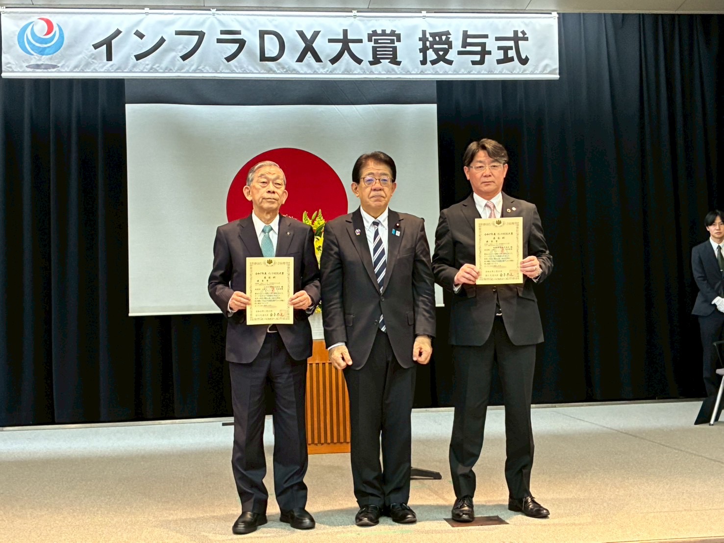 2026年1月13日 国土交通大臣様より、弊社で施工を行った「総選除)4嵐山ー17号 本体整備その2工事」において、令和7年度インフラDX大賞優秀賞を頂きました。