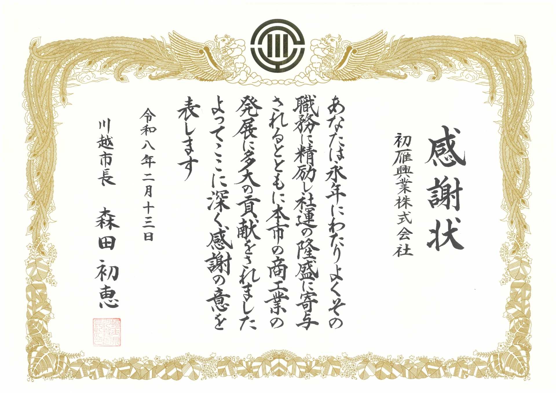 また、同時に川越市長から長年の職務に対して感謝状を頂きました。