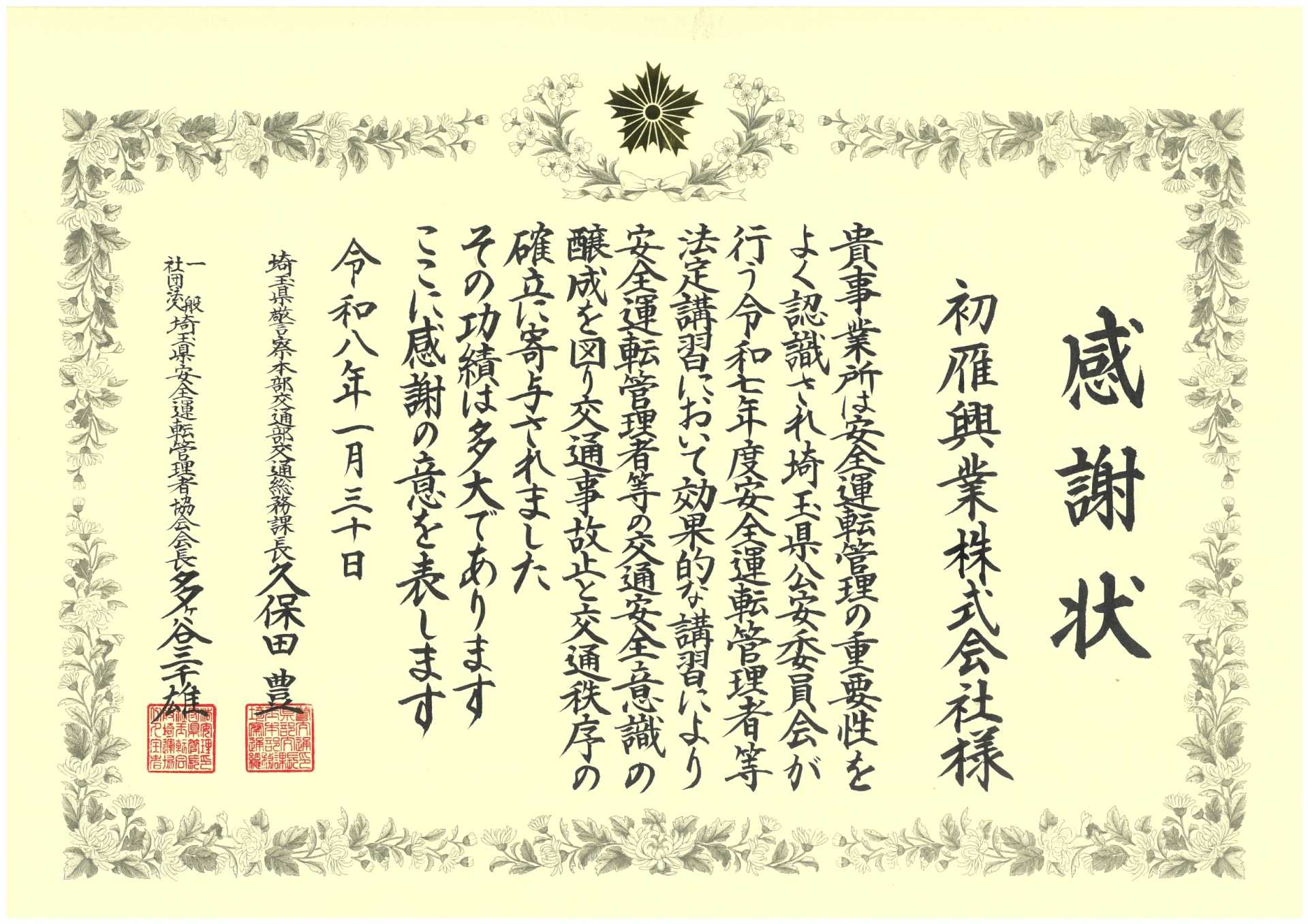 2026年1月30日 安全運転管理者等法廷講習にて、交通安全意識向上に努めたことで、埼玉県公安委員会様より感謝状を頂きました。