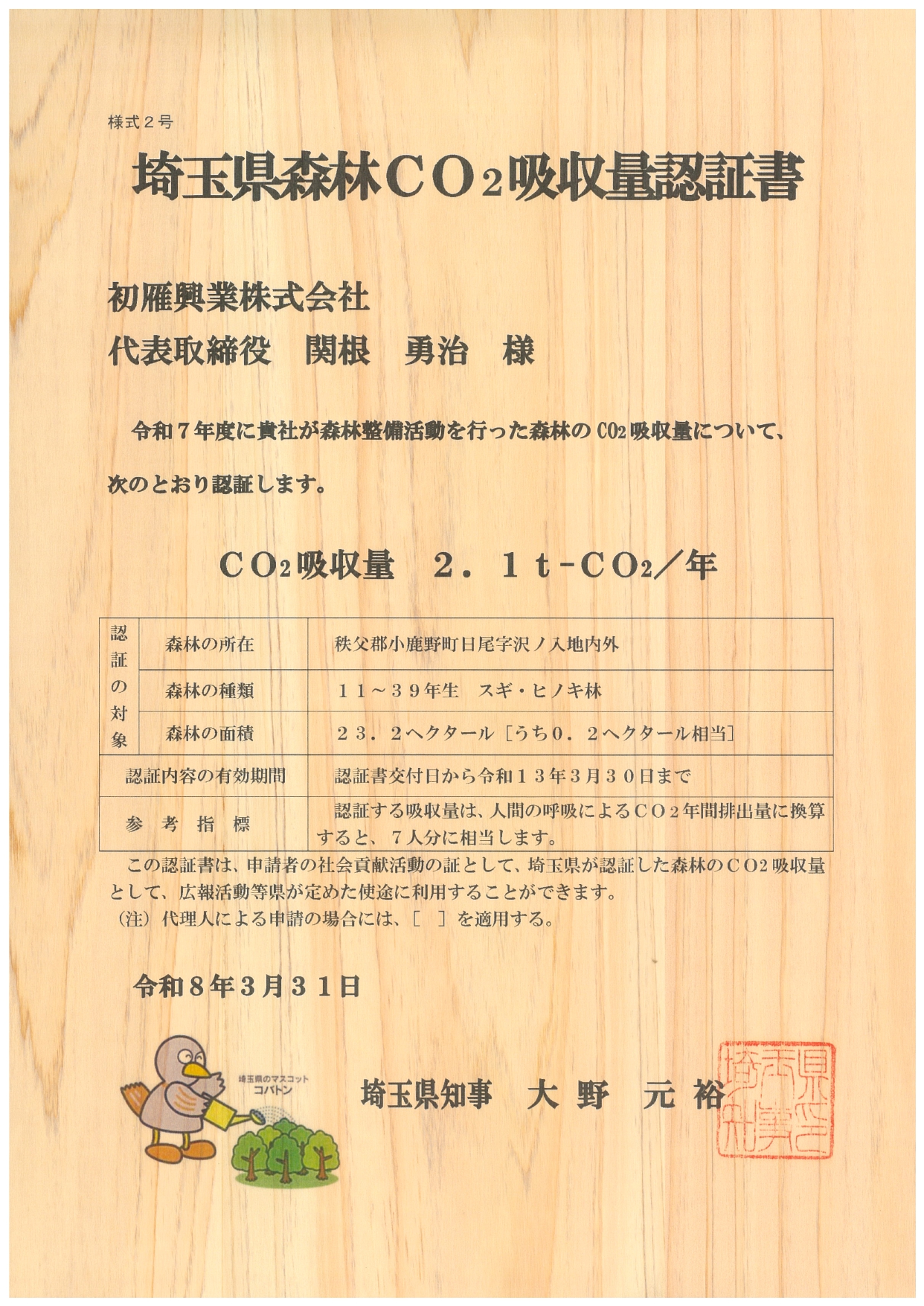 2026年3月31日 弊社は、公益社団法人埼玉県緑化推進委員会様より、「埼玉県森林CO2吸収量認定証」を頂きました。